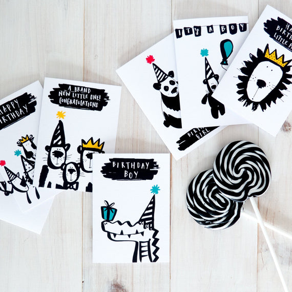 Celebrate a special boy's birthday with this snappy little Lion illustration on a birthday card created by Rebecca Cahill Roots at Betty Etiquette.