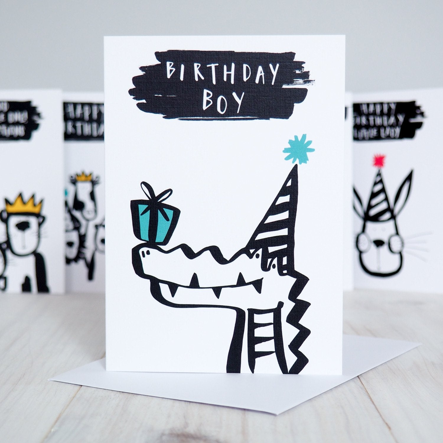 Celebrate a special boy's birthday with this snappy little Alligator illustration on a birthday card created by Rebecca Cahill Roots at Betty Etiquette.