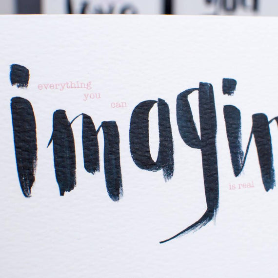 Bold, inky words combine with a refined, typewritten note in a message reading ‰۪Everything You Can Imagine Is Real‰۪. Printed on high quality textured card, it‰۪s a perfect sophisticated little greeting card for a wife, girlfriend or gorgeous best friend who needs reminding she‰۪s fantastic, or who's about to take a big step into a creative new job.