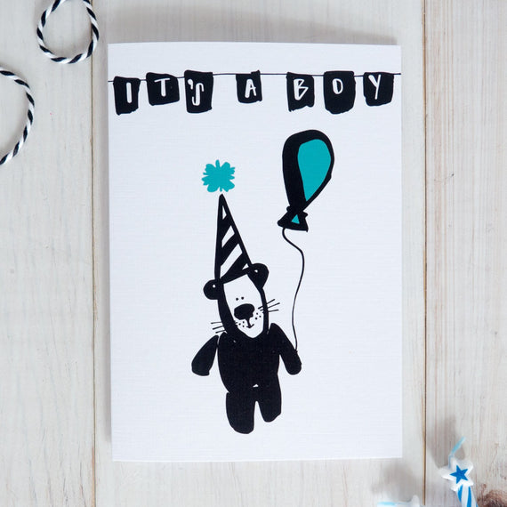 Celebrate a brand new baby boy with this cute little animal character. It's a great way to welcome the new arrival into the world. The face of the card includes the message 'It's A Boy!' using modern lettering by Betty Etiquette. Printed on high quality textured card, it‰۪s an ideal card for a very special new baby boy.
