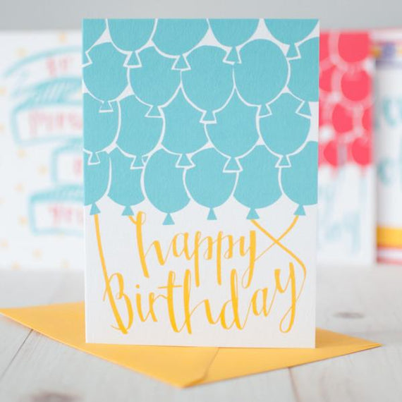 The design features hand drawn balloons with illustrated message reading 'Happy Birthday' to bring a classy splash of colour to a birthday celebration. Whether adult or child, this is an ideal birthday card for lovers of bold contemporary design. Unique to Betty Etiquette, it won't disappoint.