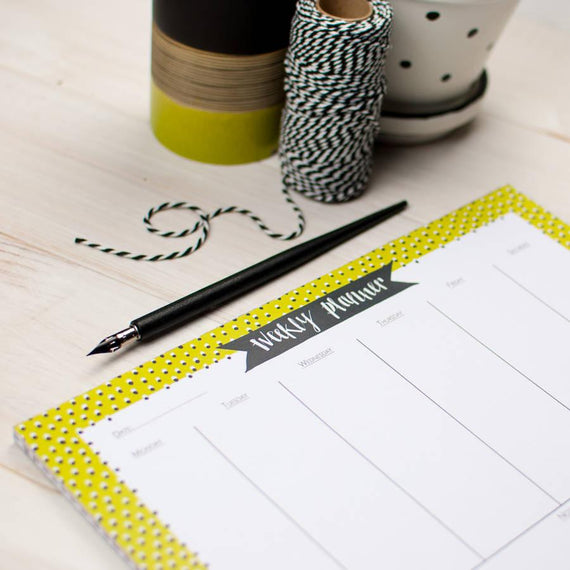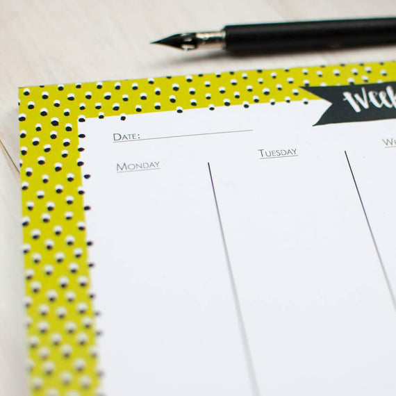 A gorgeous A4 weekly planner desk pad with 52 tear-off sheets in a bright green polka dot spots design.
