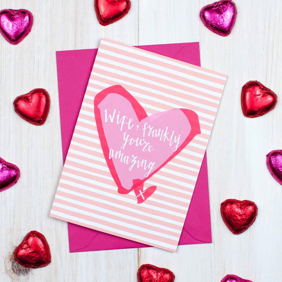 The wedding anniversary card design features a set of hand-drawn pink hearts on a peach and white Parisian stripe, with Rebecca Cahill Roots' contemporary calligraphy reading 'Wife, Frankly You're Amazing'.